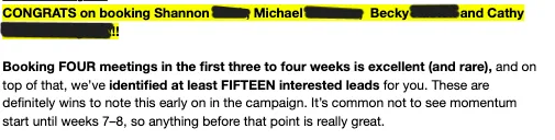 So rather than promise or guarantee you a certain number of meetings – what we CAN promise you is that our process works, we have a track record of client results, and we will do everything in our power to help you see results.